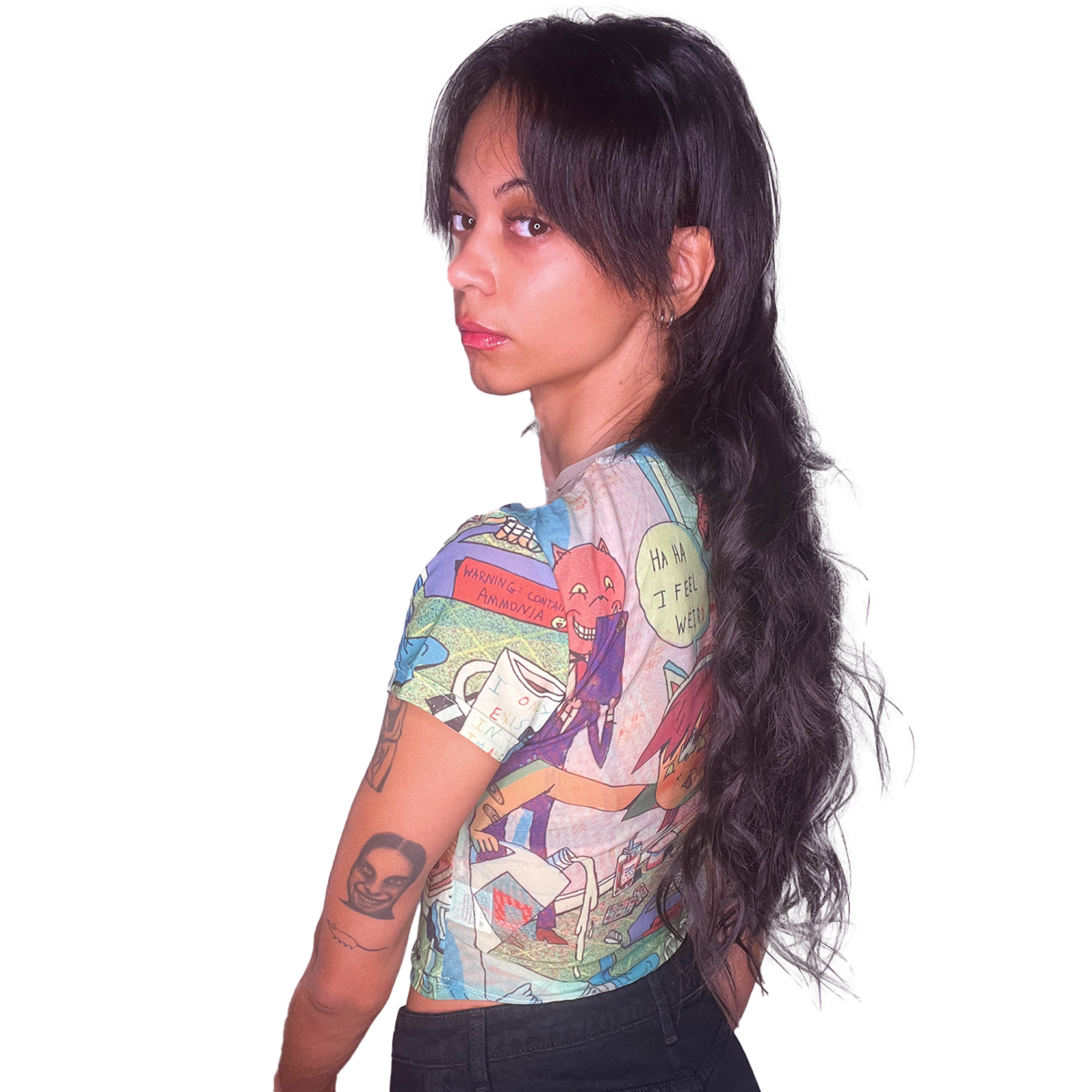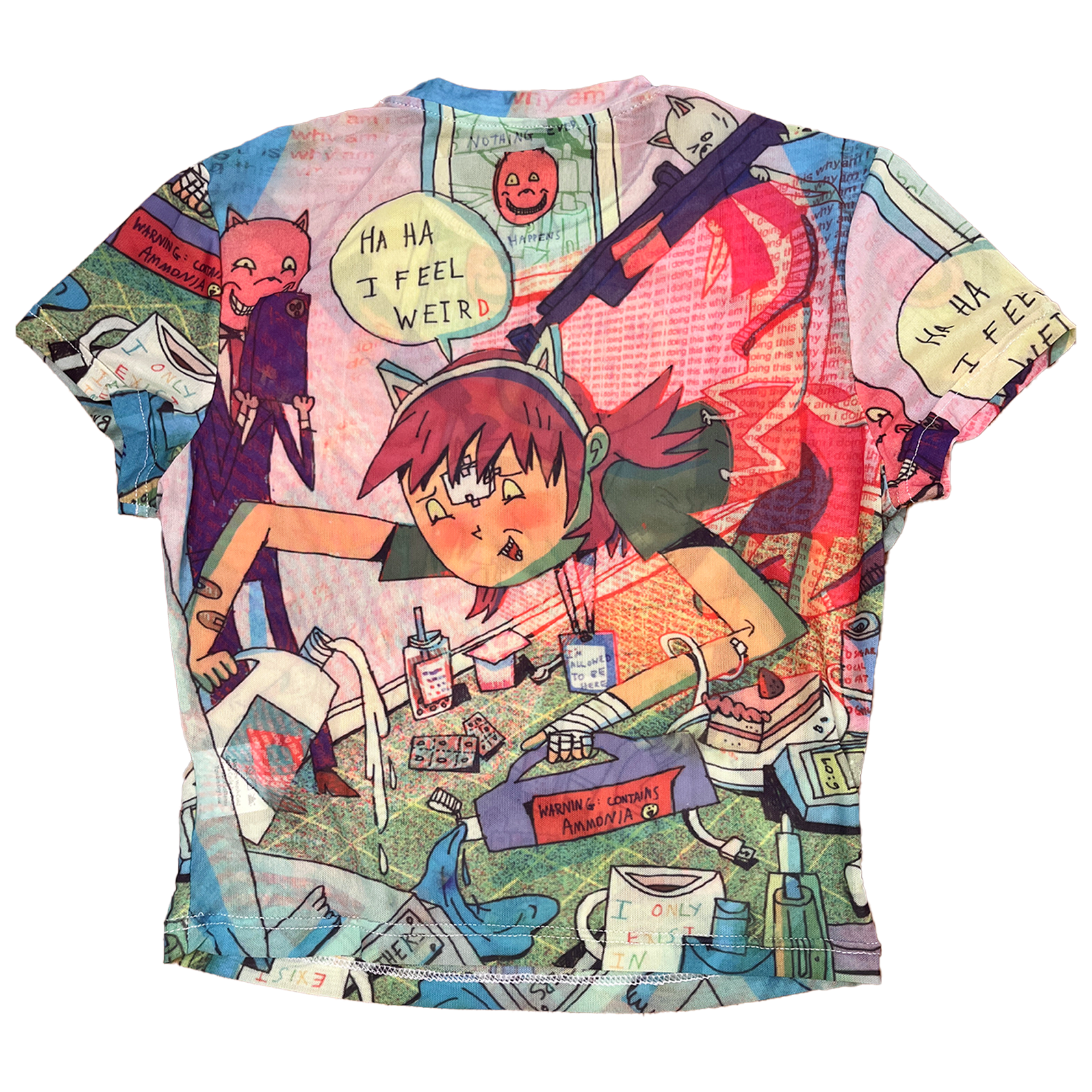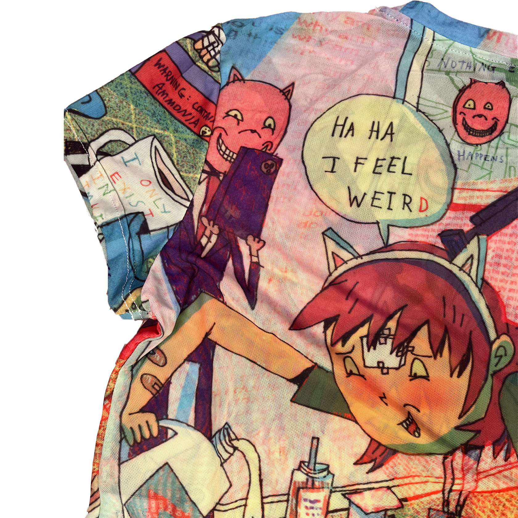 short sleeve stretchy mesh tee with "Ha Ha I Feel Weird" print all-over