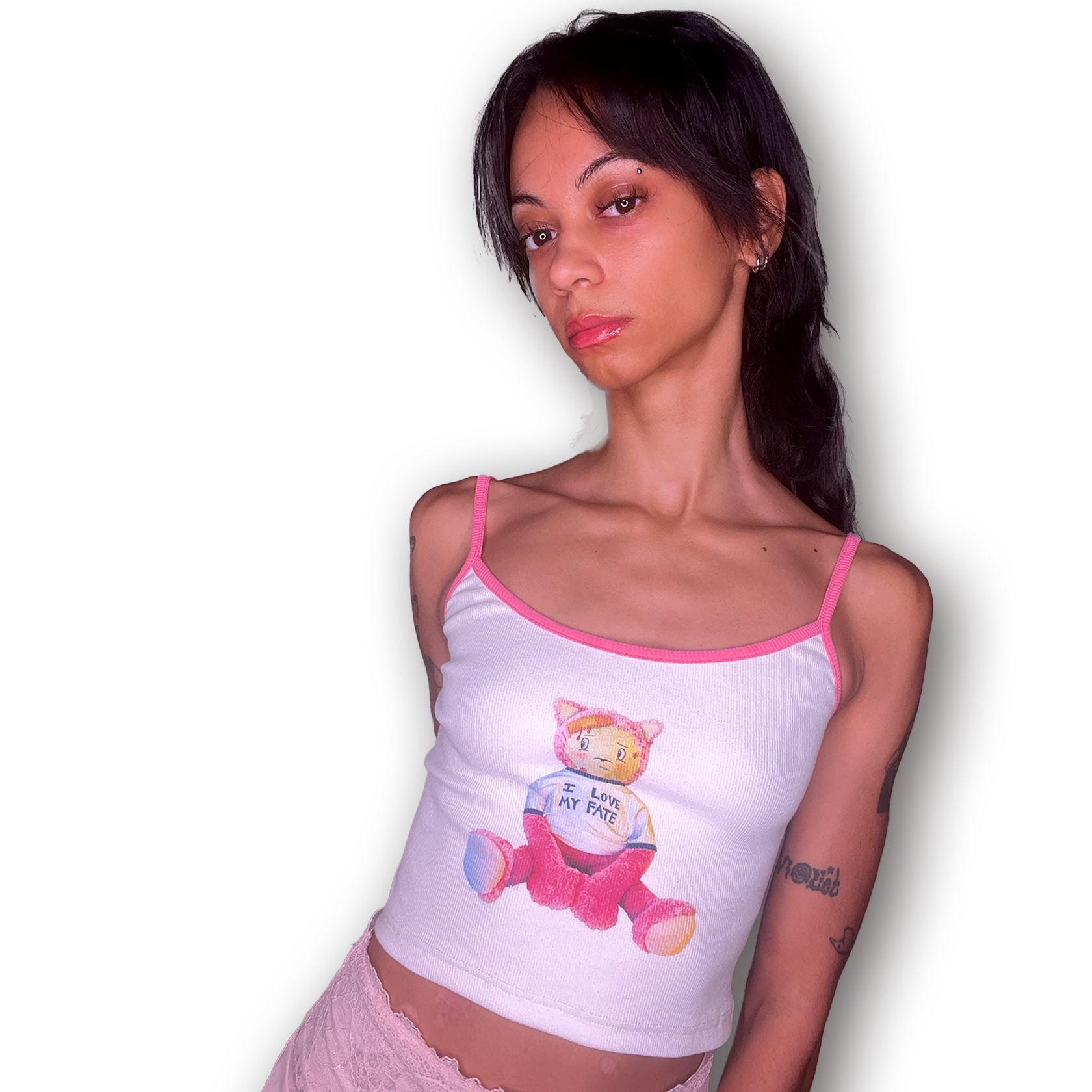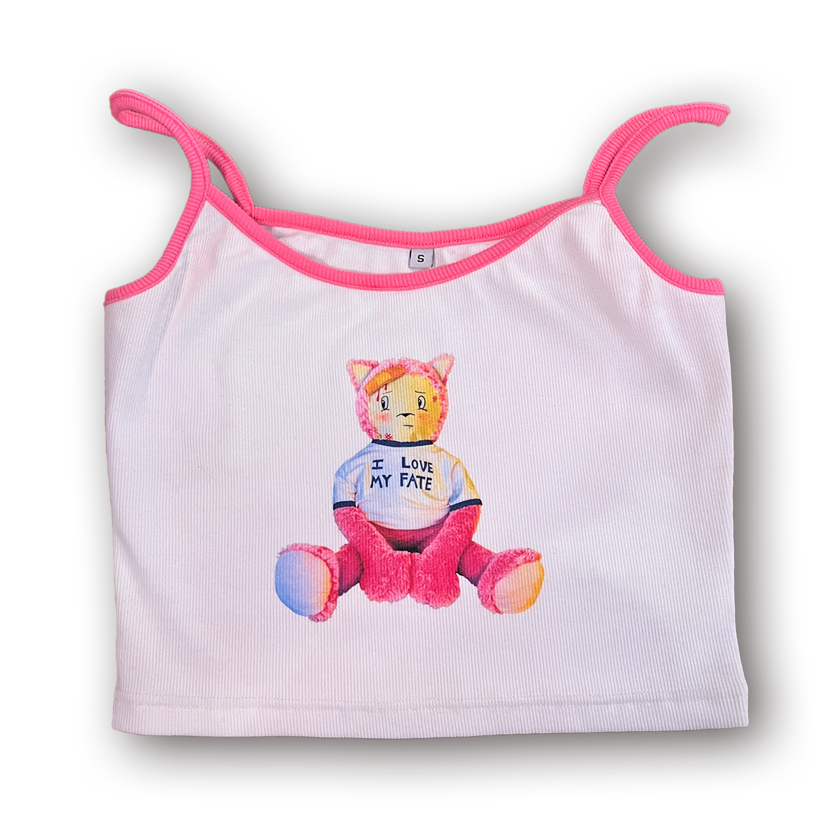 Stretchy ribbed cotton tank top with pink accent and "I love my fate" cat design print